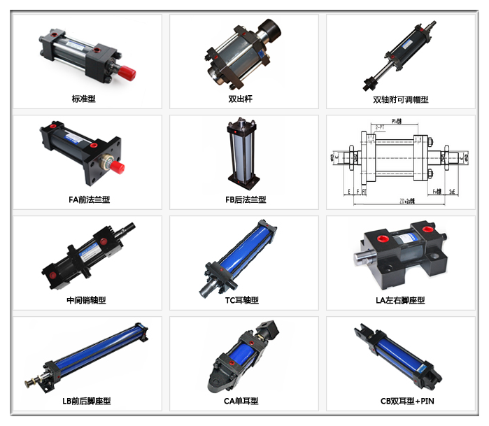 標(biāo)準(zhǔn)型、雙出桿、雙軸附可調(diào)帽型、FA前法蘭型、FB后法蘭型、中間銷軸型、TC耳軸型、LA左右腳座型、LB前后腳座型、CA單耳型、CB雙耳型+PIN。